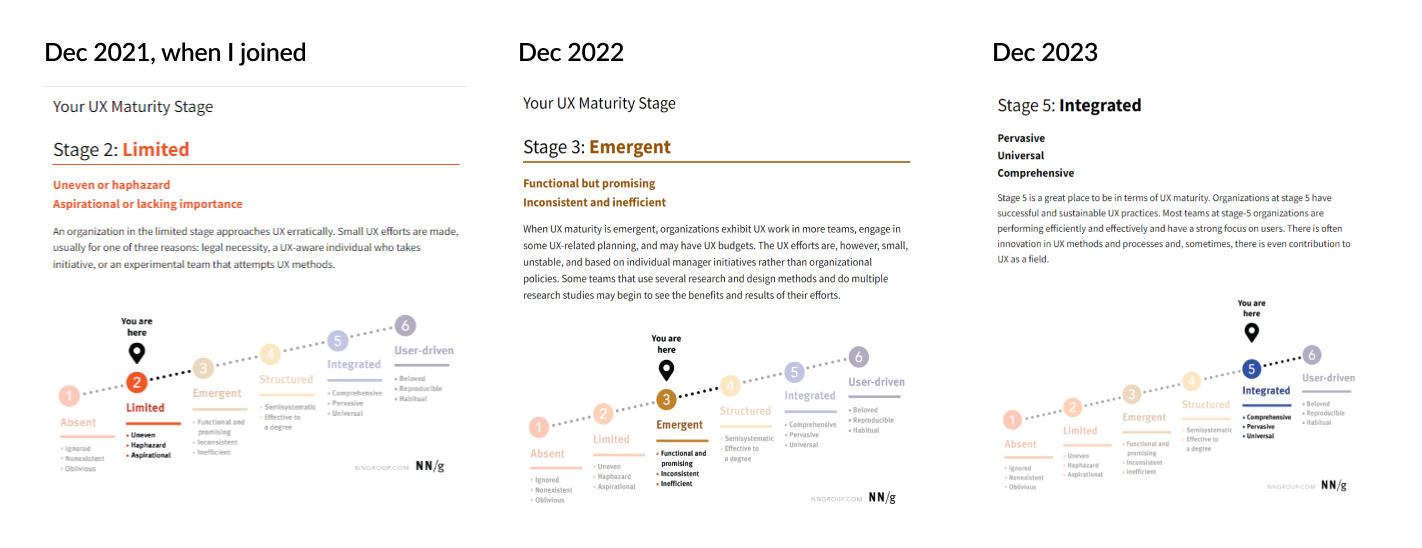 Using the maturity model by NN/g, I tracked the organization’s UX maturity over the years.